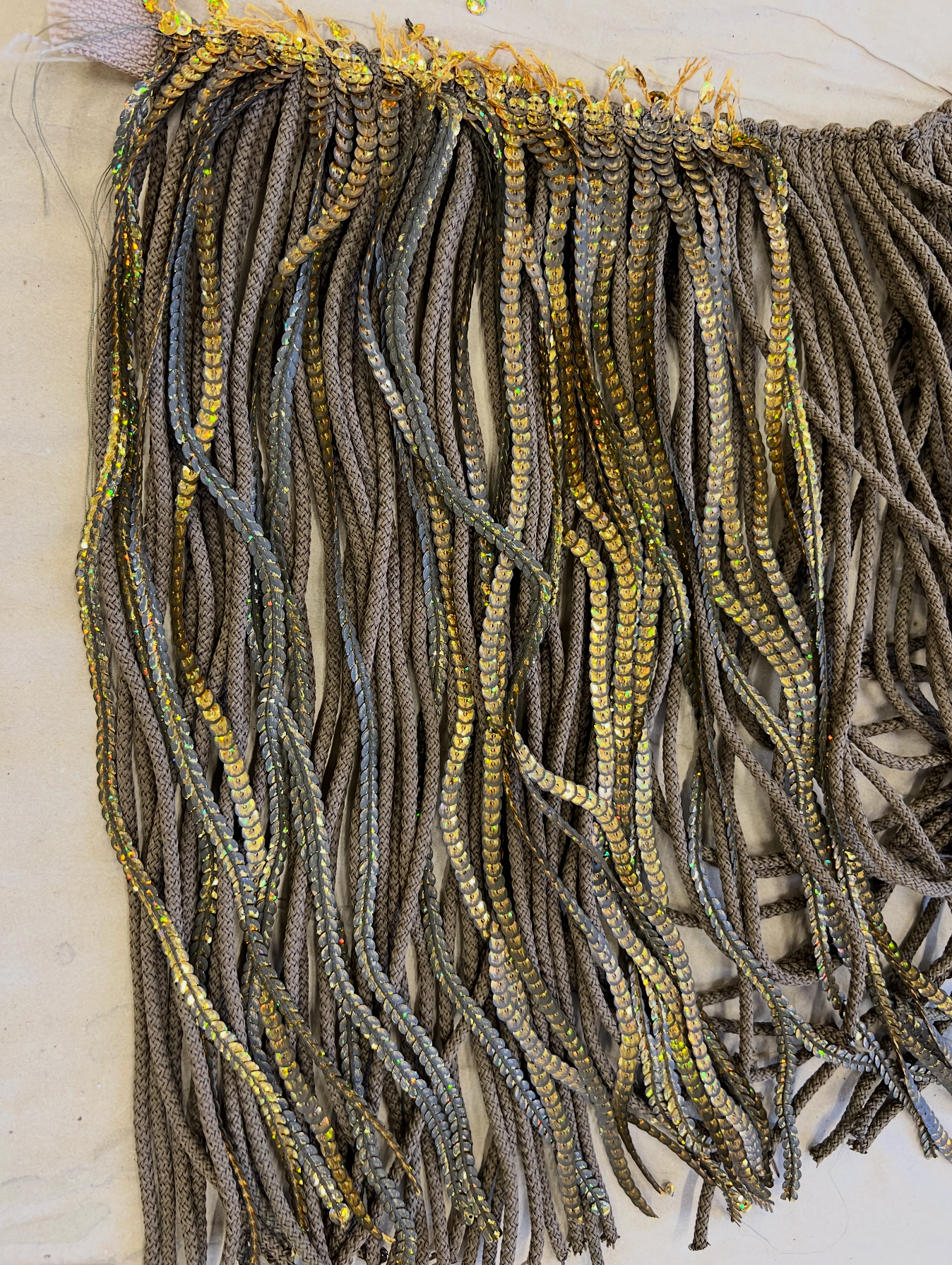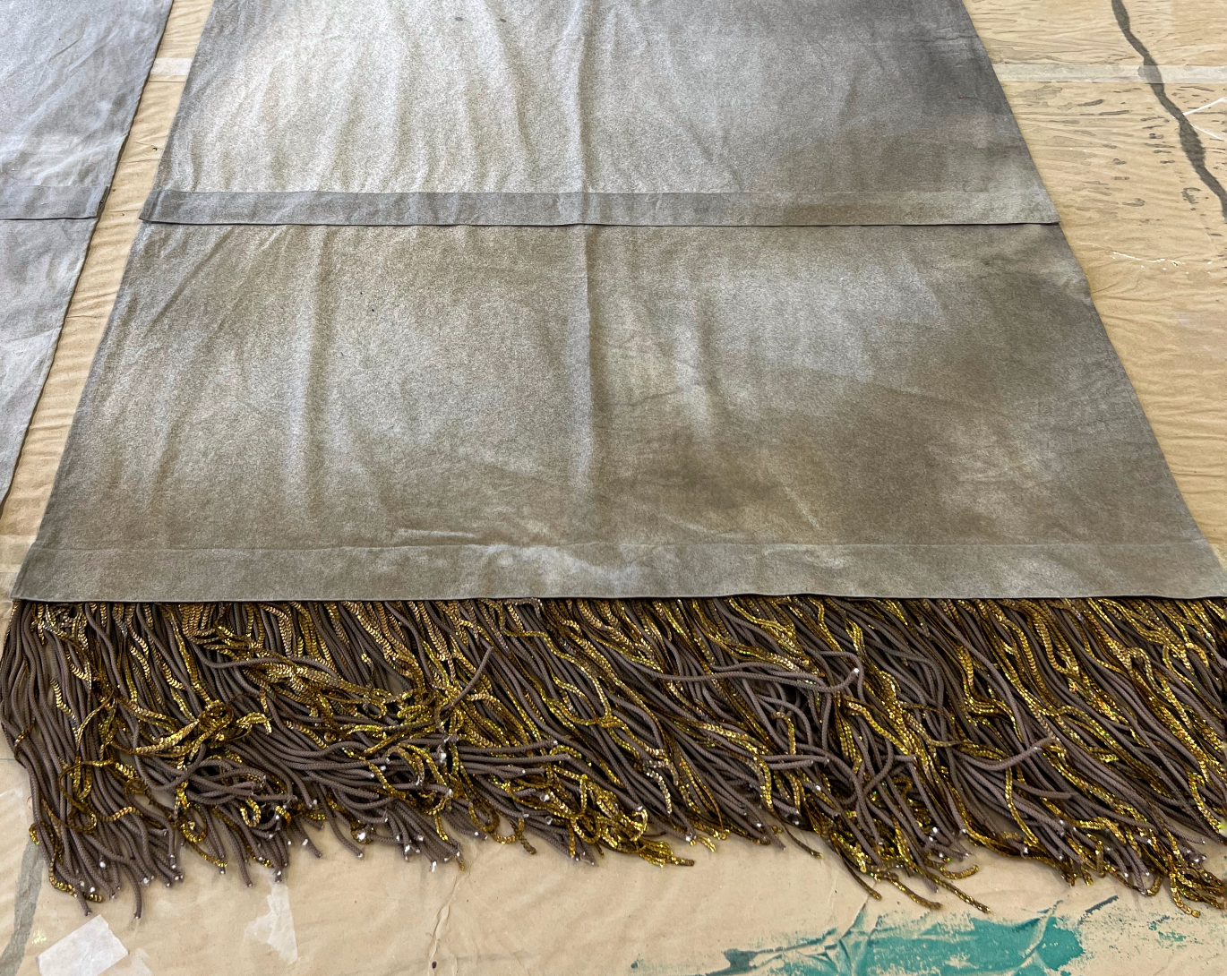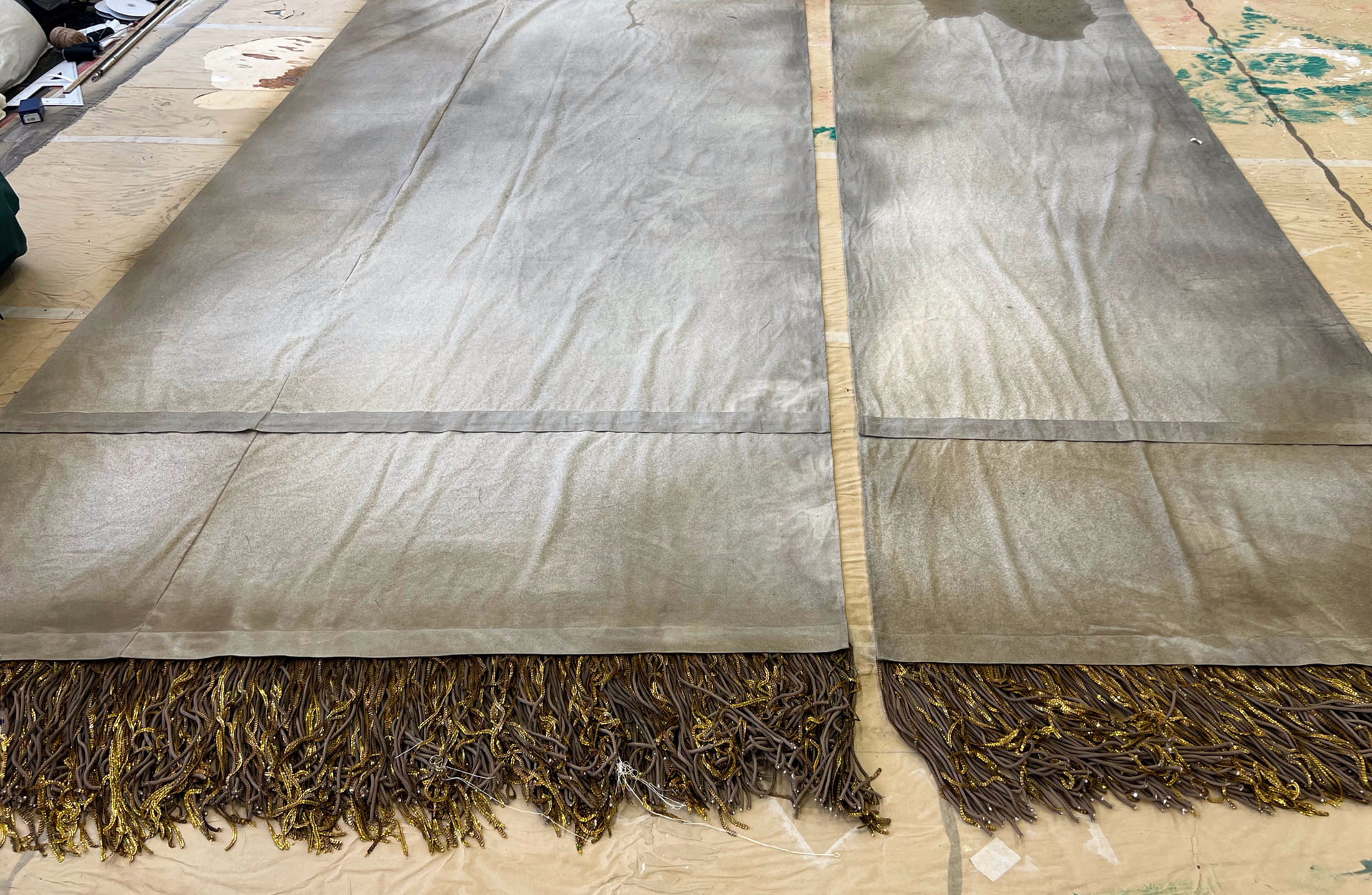 Бахрому сшили сами. Вручную. Подбирали шнур, тонировали пайетки, смешивали составы, чтобы добиться того самого оттенка «старого золота» — не кричащего, не парадного. Это была чистая театральная алхимия: создать ветхость, которая выглядит дороже любого современного лоска. Ветхость, за которой угадываются десятилетия сценической жизни.