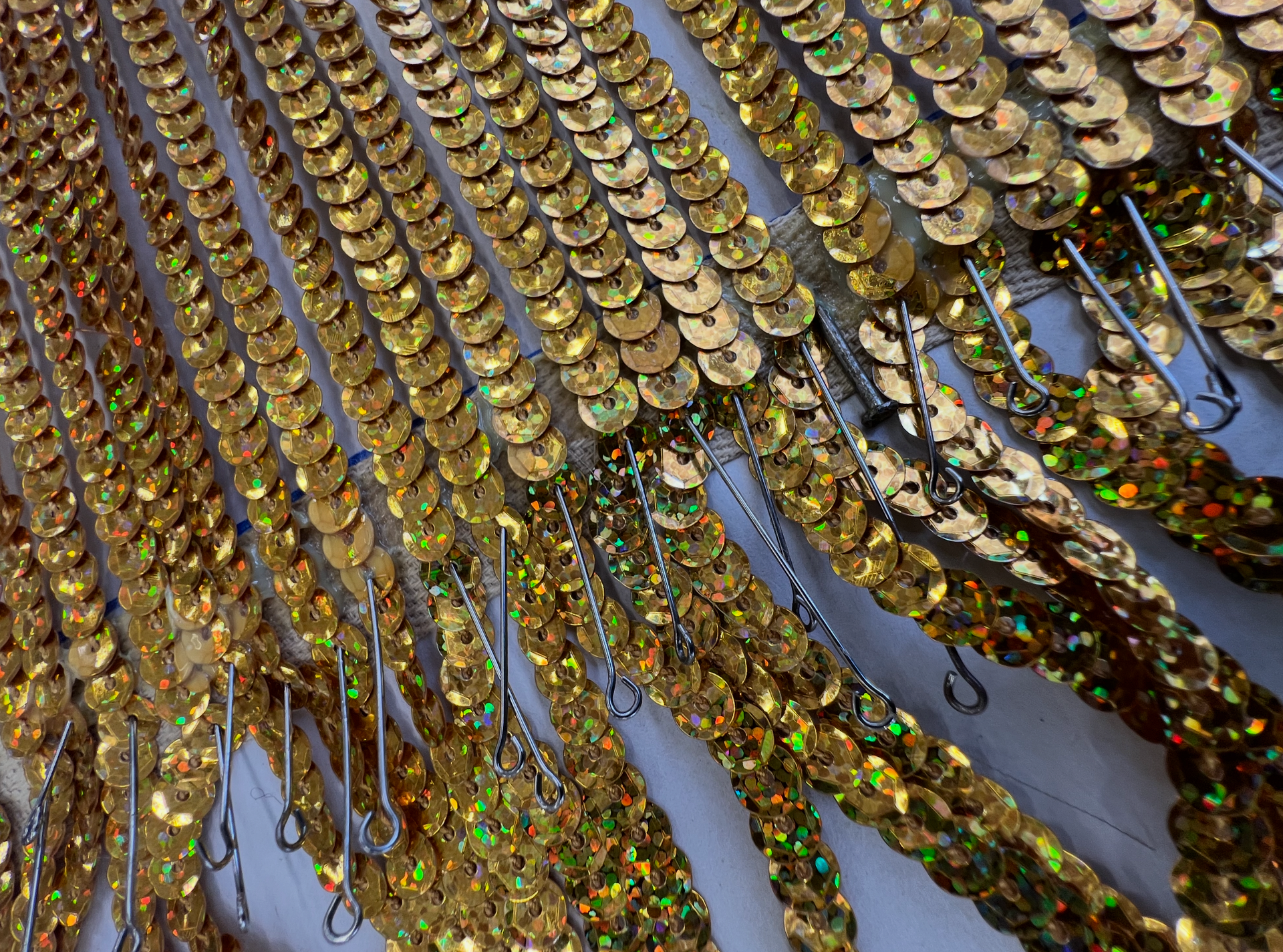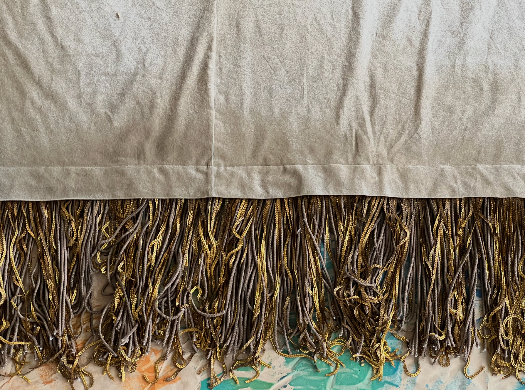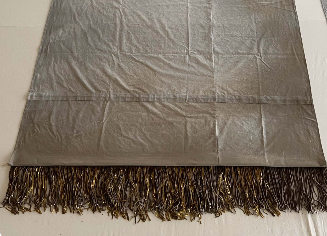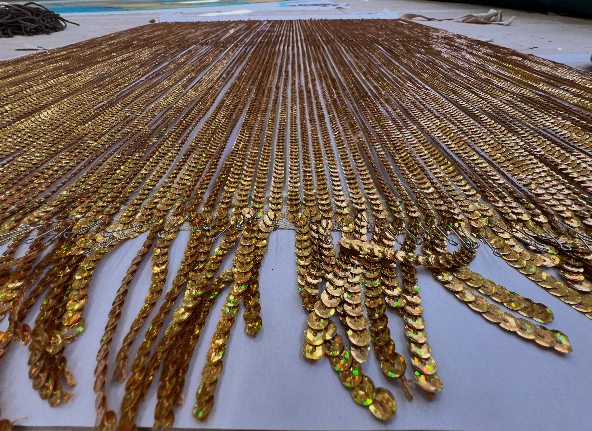 Бахрому сшили сами. Вручную. Подбирали шнур, тонировали пайетки, смешивали составы, чтобы добиться того самого оттенка «старого золота» — не кричащего, не парадного. Это была чистая театральная алхимия: создать ветхость, которая выглядит дороже любого современного лоска. Ветхость, за которой угадываются десятилетия сценической жизни.