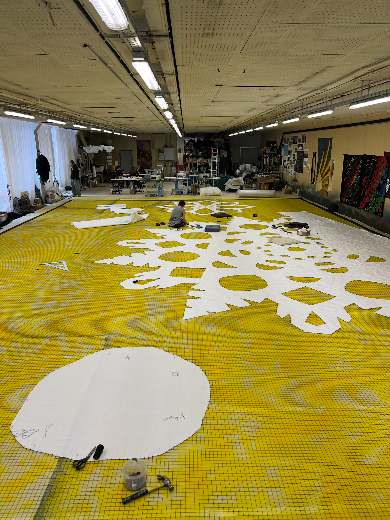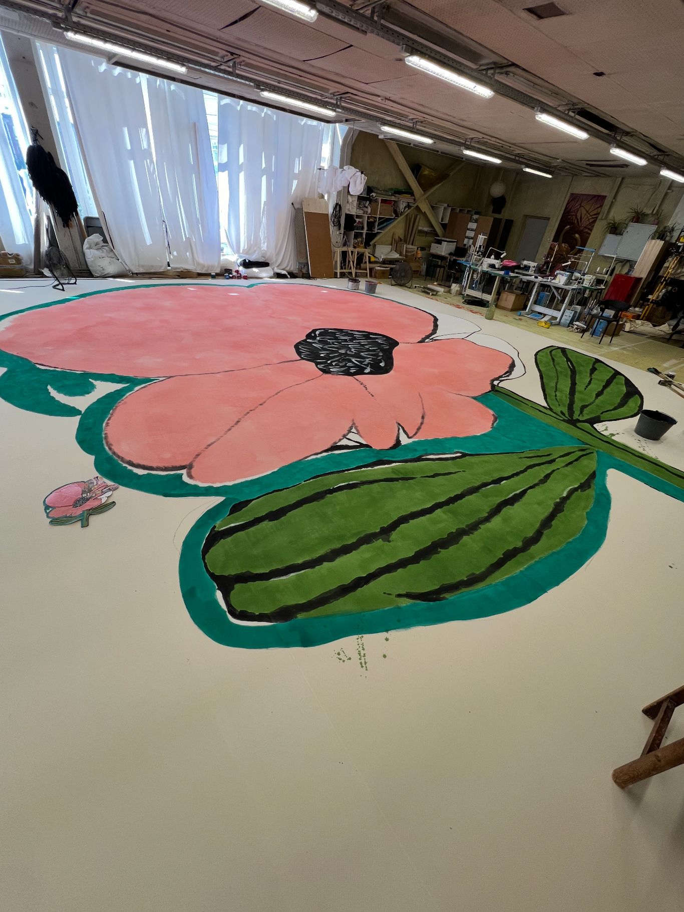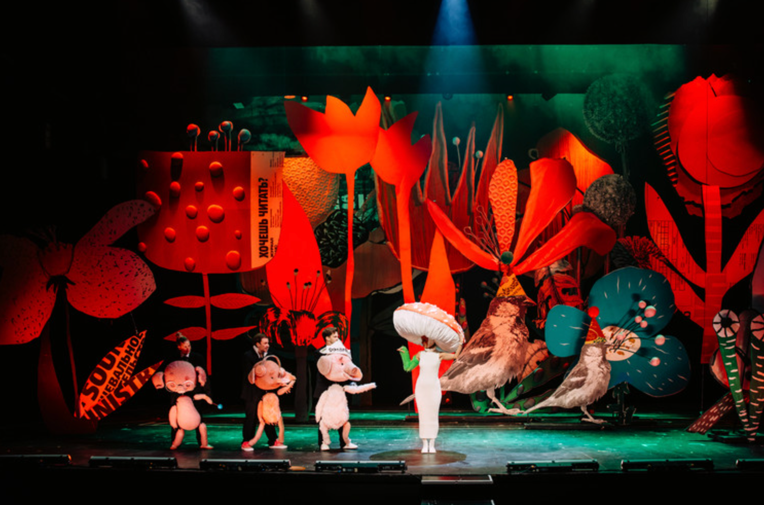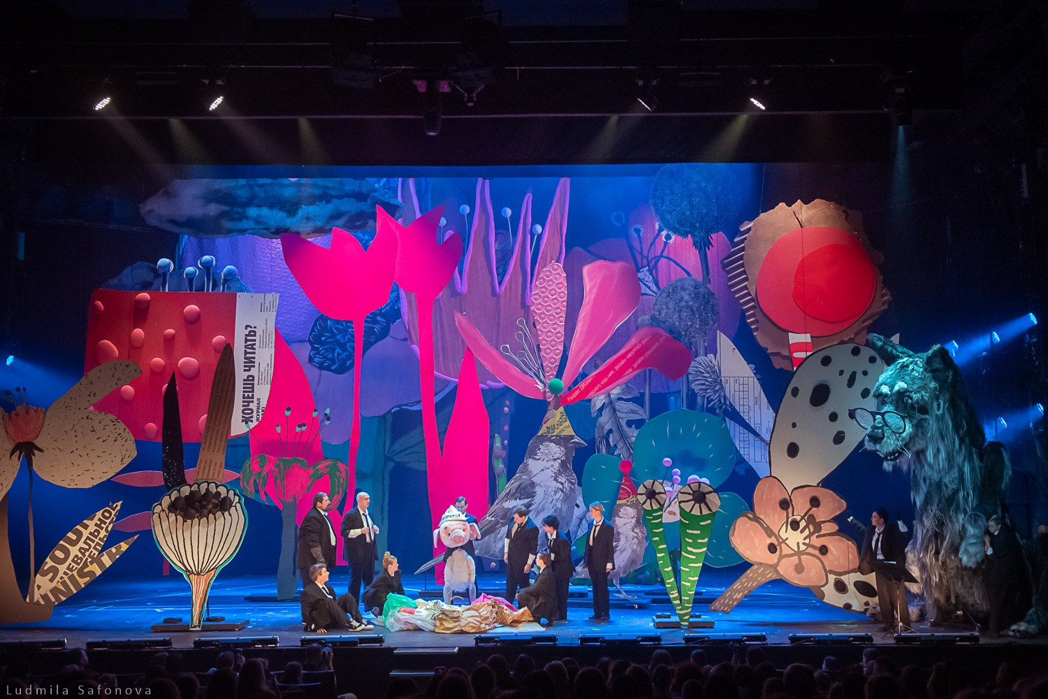 Итак, что же мы «смягчили»? В первой картине, «Лето», на заднем плане красовались огромные цветы. Мы взяли и сделали их на сетке дель. Это наша классика: сетка с крупной ячейкой становится невидимым каркасом, который держит форму. Спереди мы нанесли живопись и сложную аппликацию из разных тканей, чтобы получить нужные фактуры. Концепция требовала, чтобы всё выглядело так, будто эти элементы вырезаны детьми из картона, цветной бумаги и старых журналов. Ткань с этой задачей справилась отлично! А сетка сзади практически исчезала для зрителя, становясь заметной лишь когда декорации наслаивались друг на друга, создавая легкий эффект коллажа, — а это вполне укладывалось в замысел.