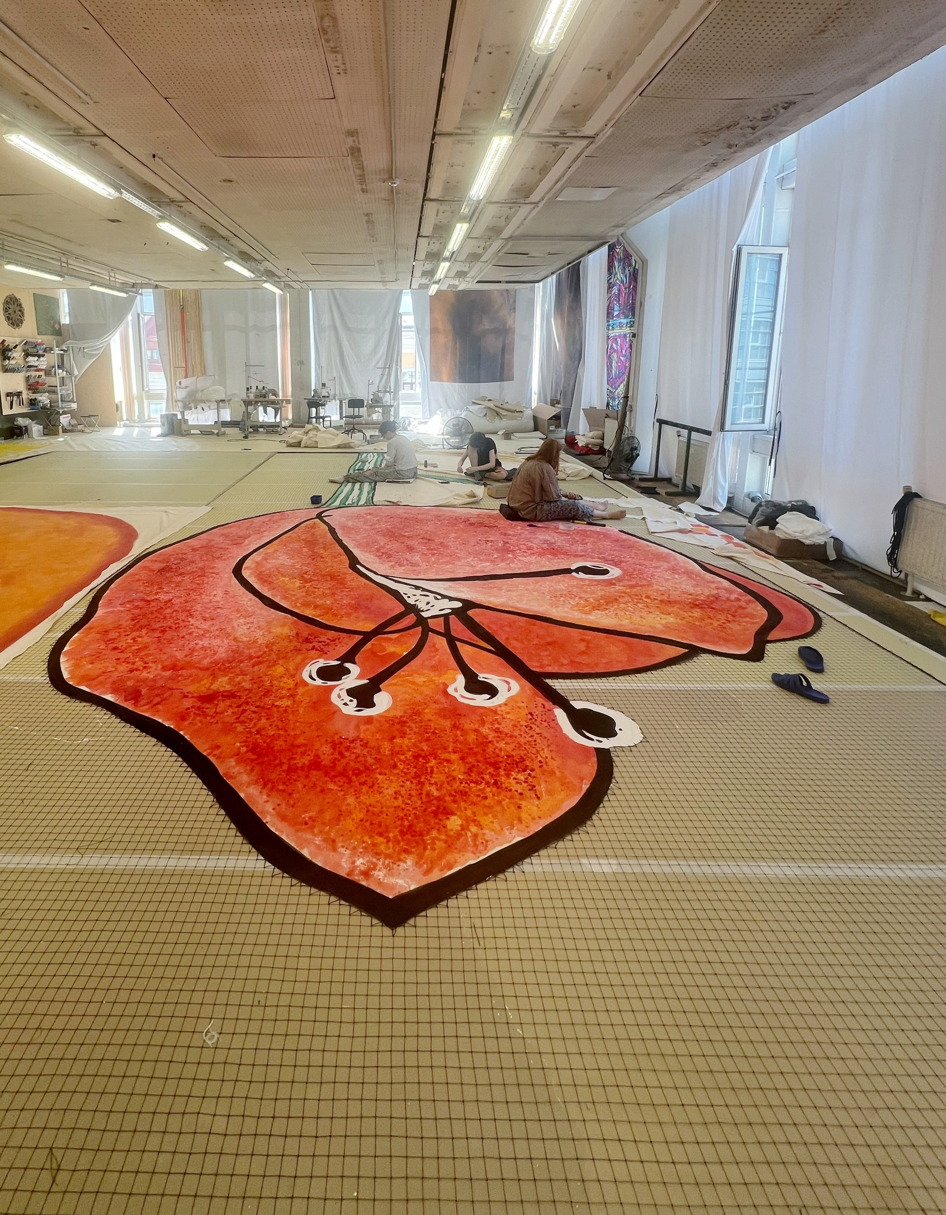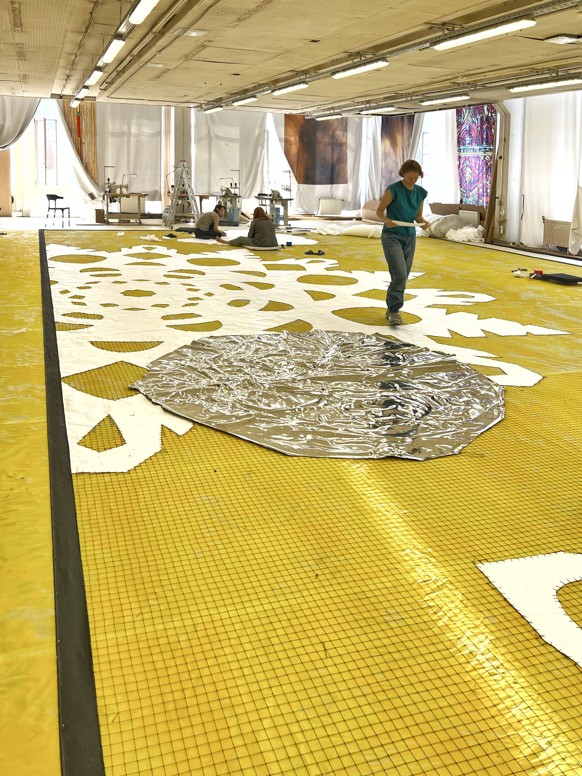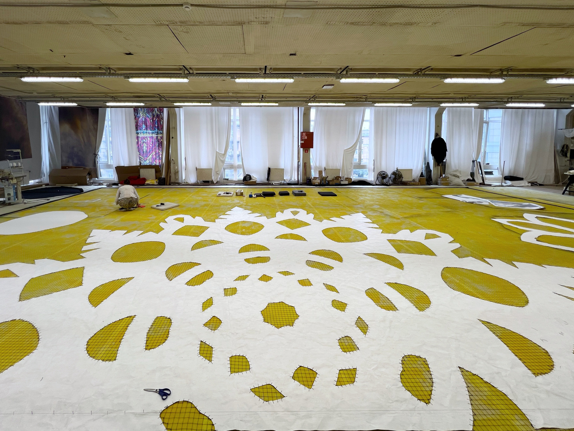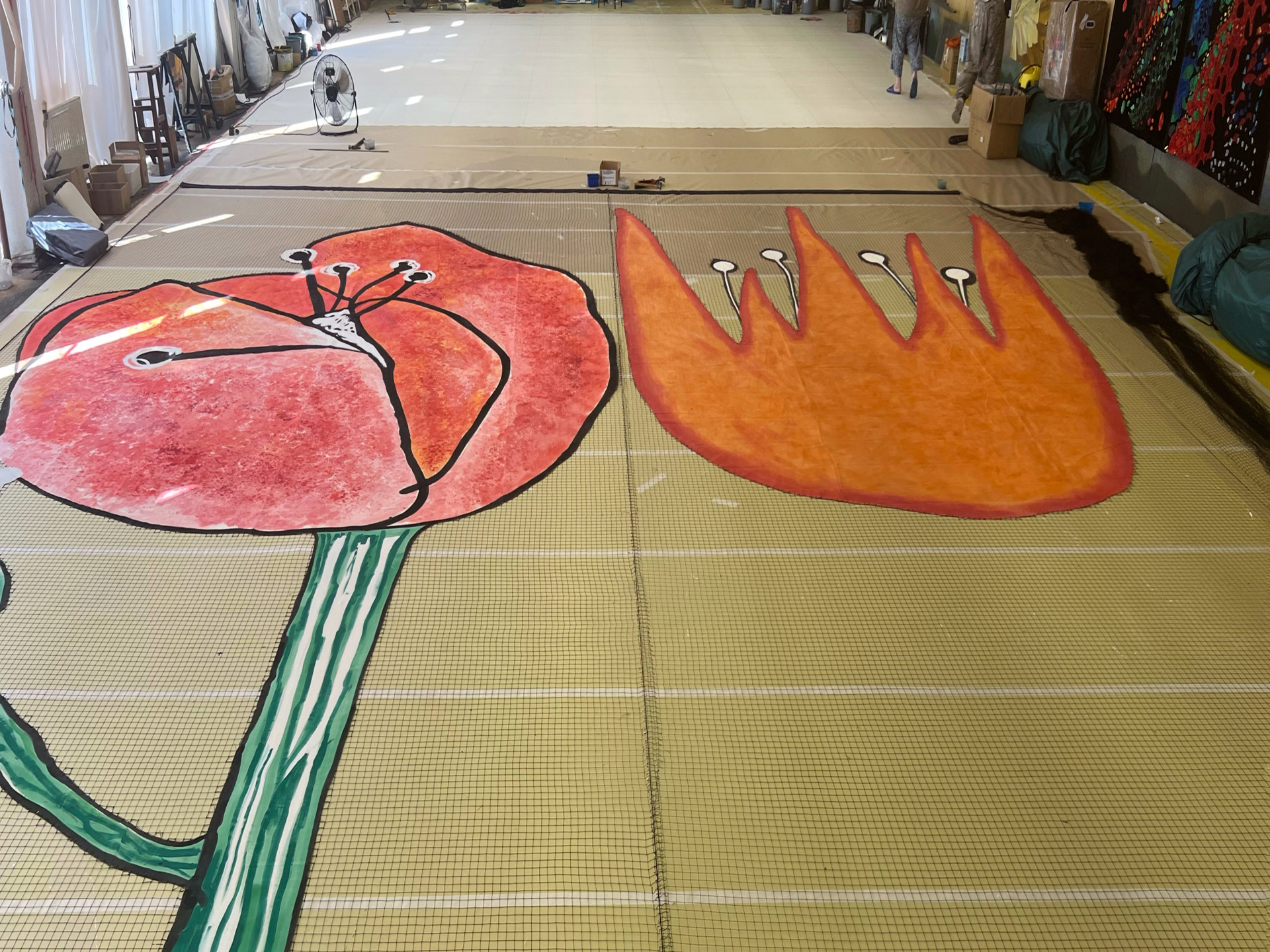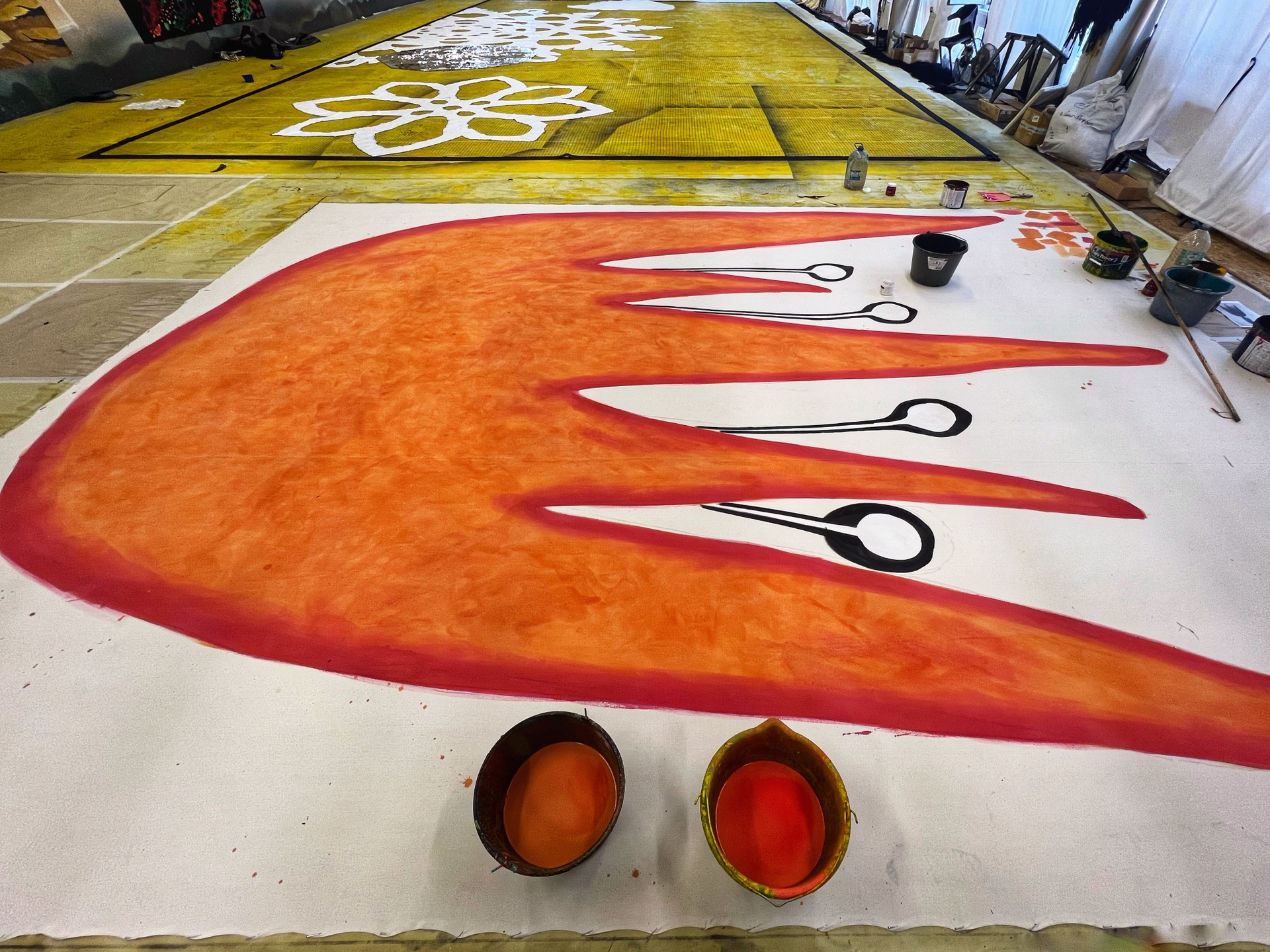 Итак, что же мы «смягчили»? В первой картине, «Лето», на заднем плане красовались огромные цветы. Мы взяли и сделали их на сетке дель. Это наша классика: сетка с крупной ячейкой становится невидимым каркасом, который держит форму. Спереди мы нанесли живопись и сложную аппликацию из разных тканей, чтобы получить нужные фактуры. Концепция требовала, чтобы всё выглядело так, будто эти элементы вырезаны детьми из картона, цветной бумаги и старых журналов. Ткань с этой задачей справилась отлично! А сетка сзади практически исчезала для зрителя, становясь заметной лишь когда декорации наслаивались друг на друга, создавая легкий эффект коллажа, — а это вполне укладывалось в замысел.