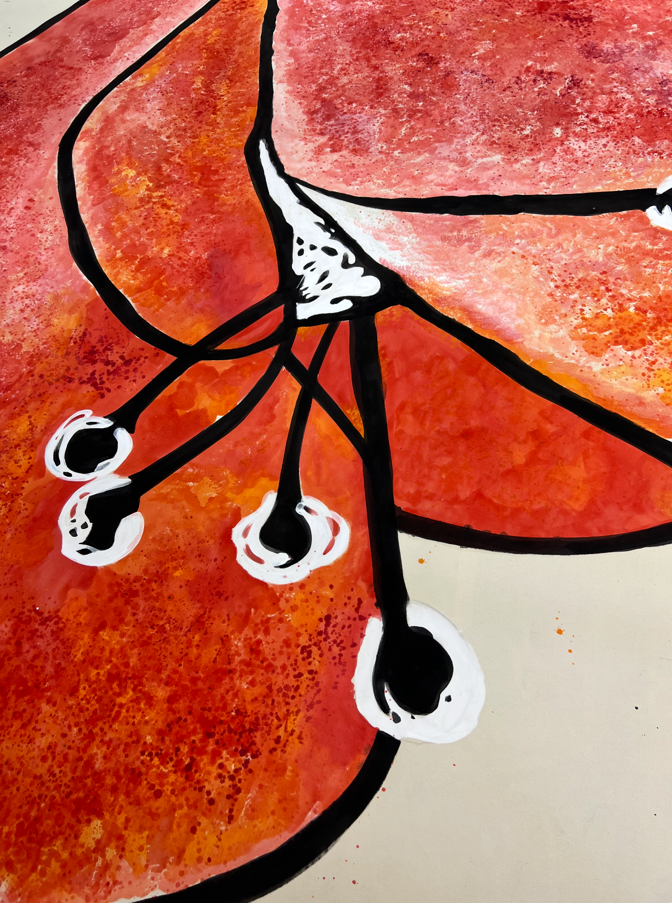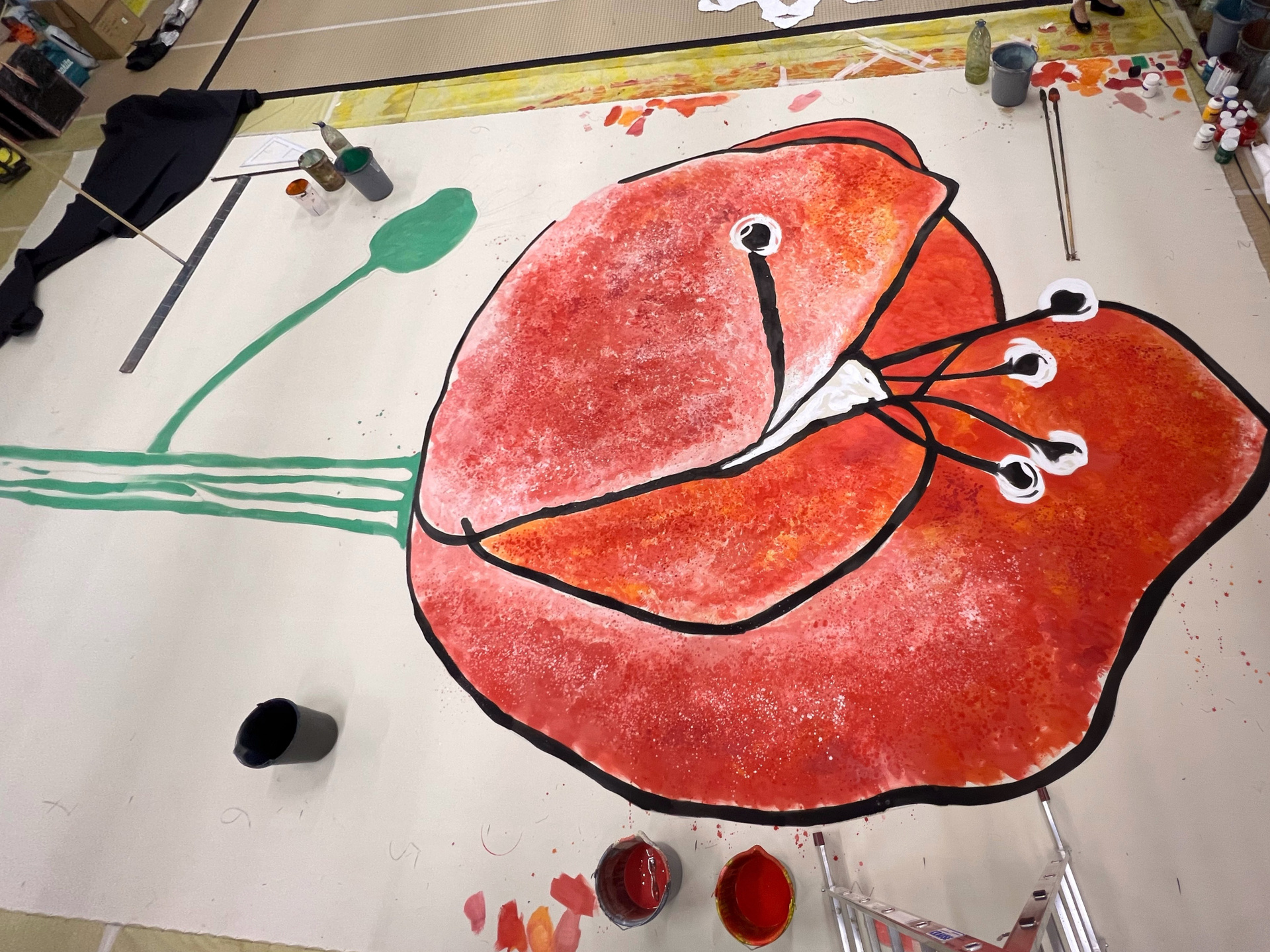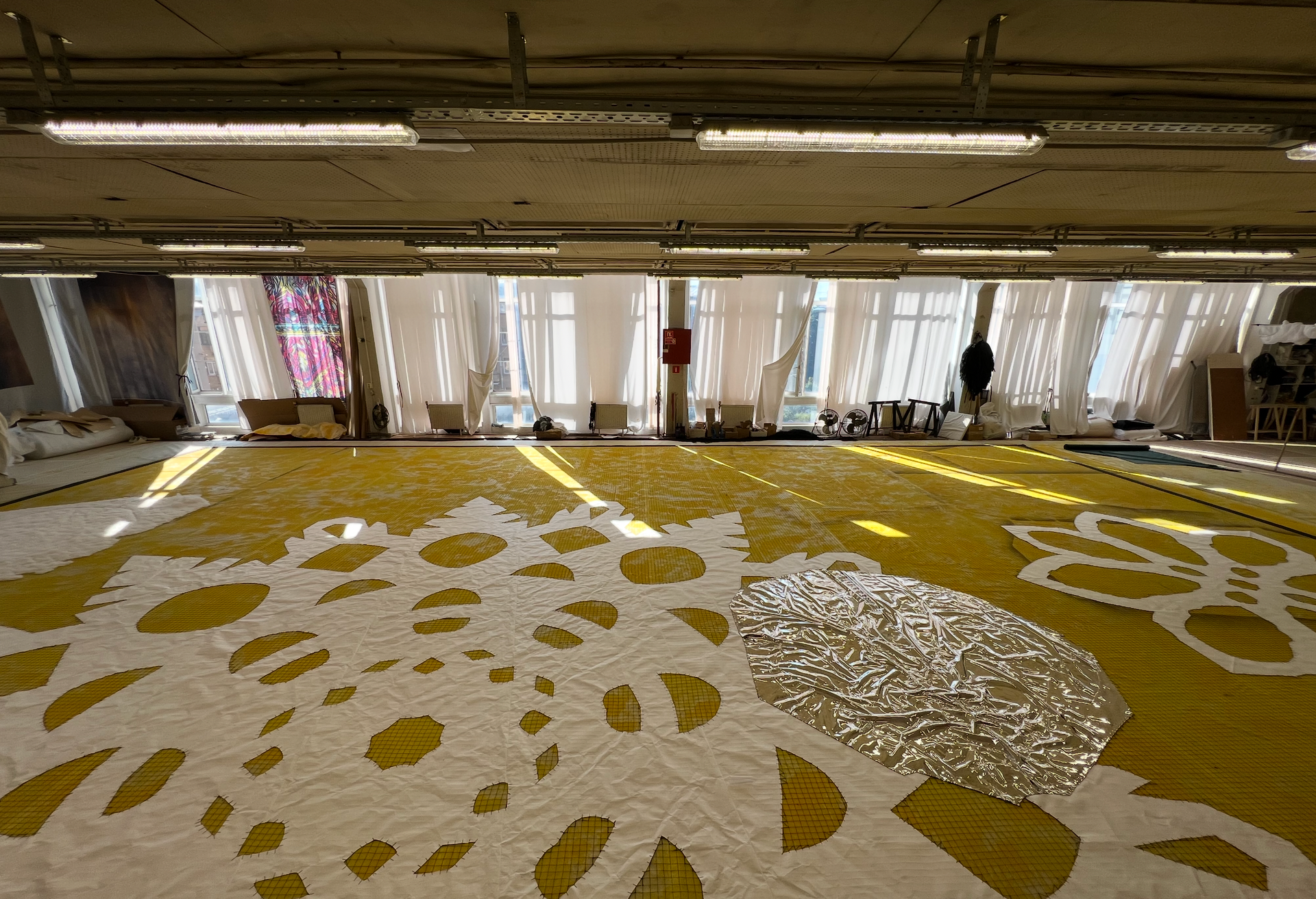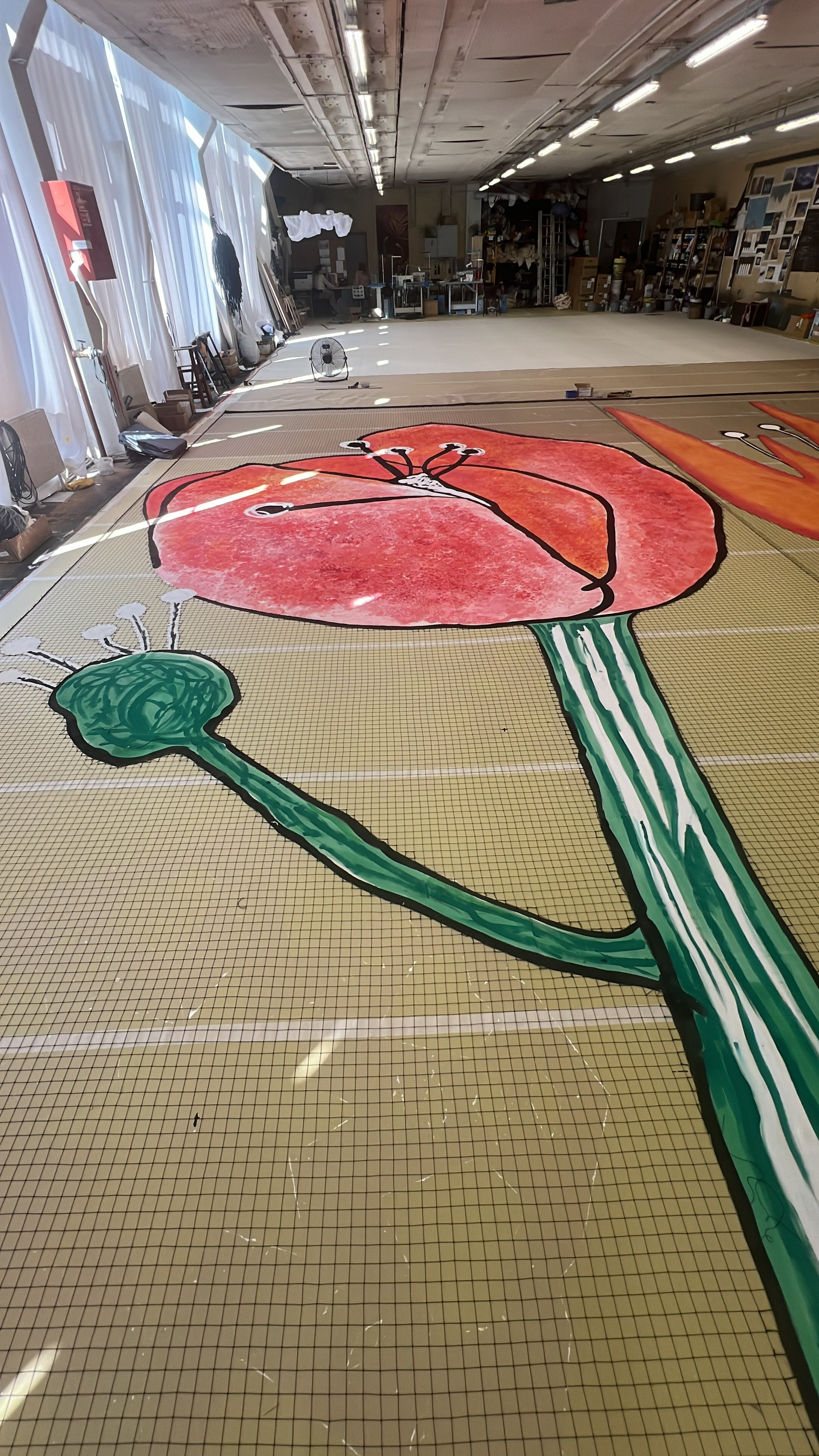 Итак, что же мы «смягчили»? В первой картине, «Лето», на заднем плане красовались огромные цветы. Мы взяли и сделали их на сетке дель. Это наша классика: сетка с крупной ячейкой становится невидимым каркасом, который держит форму. Спереди мы нанесли живопись и сложную аппликацию из разных тканей, чтобы получить нужные фактуры. Концепция требовала, чтобы всё выглядело так, будто эти элементы вырезаны детьми из картона, цветной бумаги и старых журналов. Ткань с этой задачей справилась отлично! А сетка сзади практически исчезала для зрителя, становясь заметной лишь когда декорации наслаивались друг на друга, создавая легкий эффект коллажа, — а это вполне укладывалось в замысел.