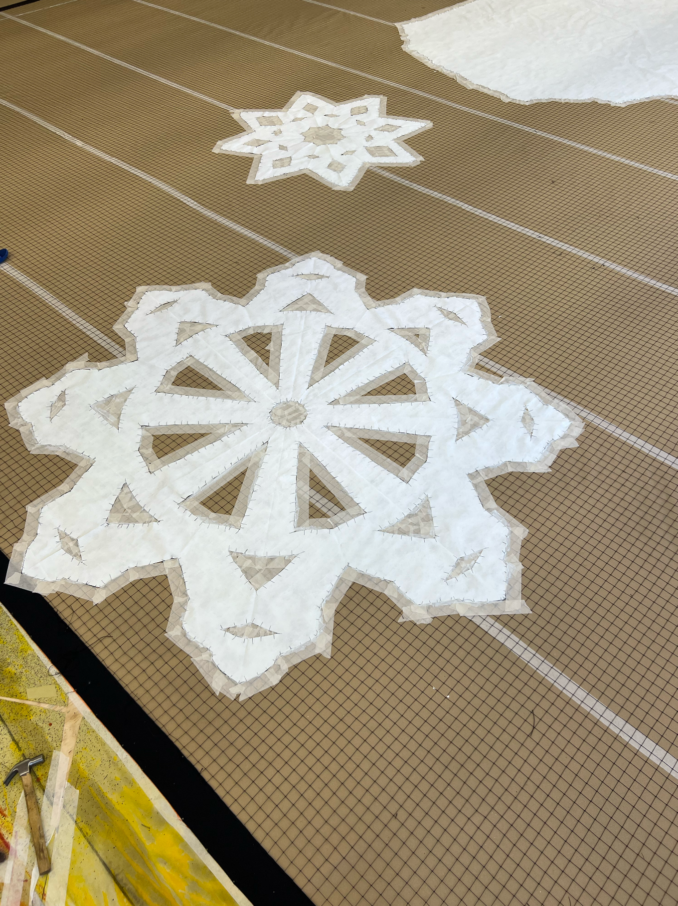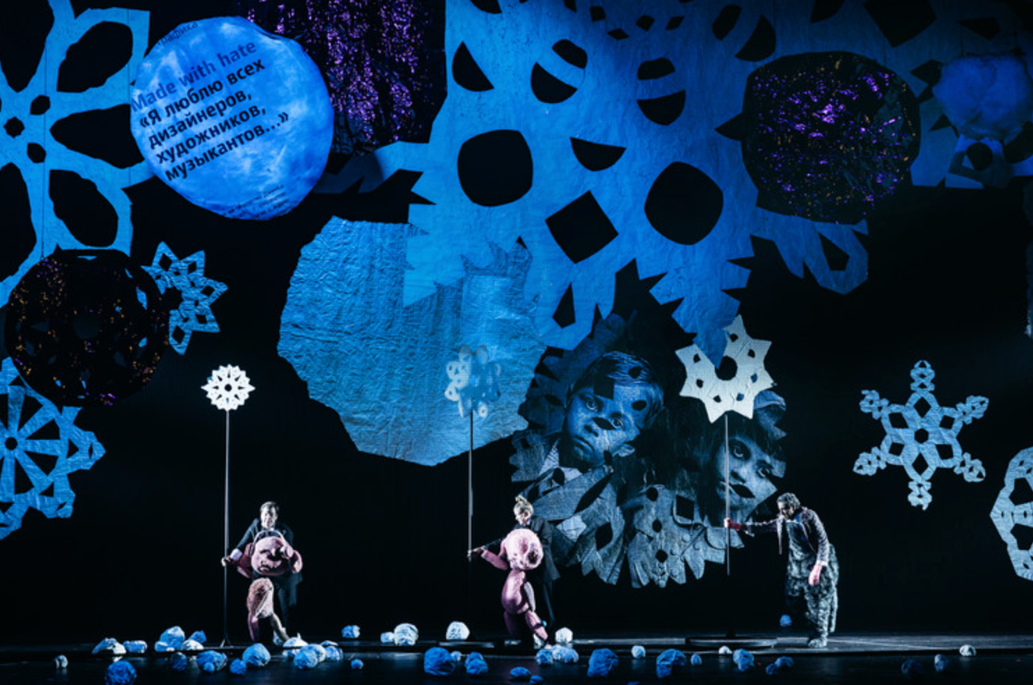 Во второй картине, «Осень», мы обошлись без мягких декораций, а вот в «Зиме» нас ждала новая задача — снежинки. Их было много, а штанкетов мало. Художник хотела развесить их широко, но все подвесные пути были заняты. Наш ответ — две большие сети из снежинок. Мы снова взяли сетку дель и разместили на ней целые гроздья снежинок, выполненных в той же технике аппликации. Почему не всё сделали мягким? Здесь есть важный нюанс: чтобы сетка выглядела идеально, её нужно оттягивать вниз трубой. А в динамичном спектакле с активным перемещением артистов лишние преграды на сцене ни к чему. Мы использовали ровно два плана, где это было технически оправдано и не мешало действию.